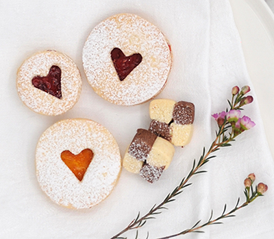 Vaahdota sokeri ja voi. Lisää kuivat aineet ja kananmuna. Laita taikinapallo puoleksi tunniksi jääkaappiin. Ota kerrallaan yksi neljäsosa taikinaa ja kaulitse se n.5mm paksuiseksi levyksi. Ota taikinasta esim. lasilla pyöreitä keksejä ja siirrä ne pellille. Käytä puolet kekseistä kansiosana, joista on sydänmuotilla poistettu keskus. Paista keksit koosta riippuen 175-150 °C:ssa kunnes saavat hieman väriä. Siirrä jäähtyneet keksit pois pelliltä ja laita keksin alapuoleen tyrni- tai vadelmahilloa. Koristele keksit tomusokerilla. Kuvan shakkiruudut on tehty lisäämäällä pieneen erään taikinaa kaakaojauhoa.